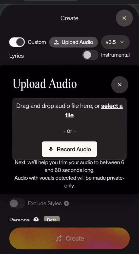 - You will see options like “Custom”, “Upload Audio”, and a place to choose the AI model (for example, v3.5 or v4.5).