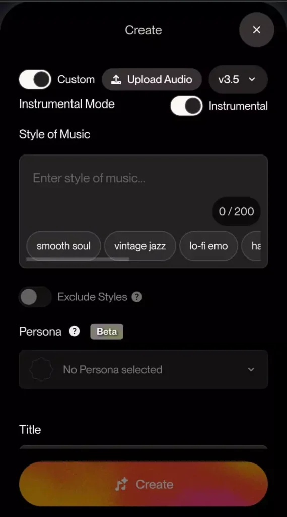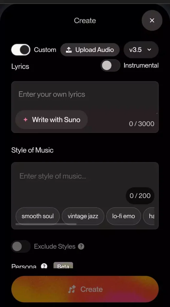 - You can select a Persona to give your song a special voice or style. This is still in Beta, so it’s optional.