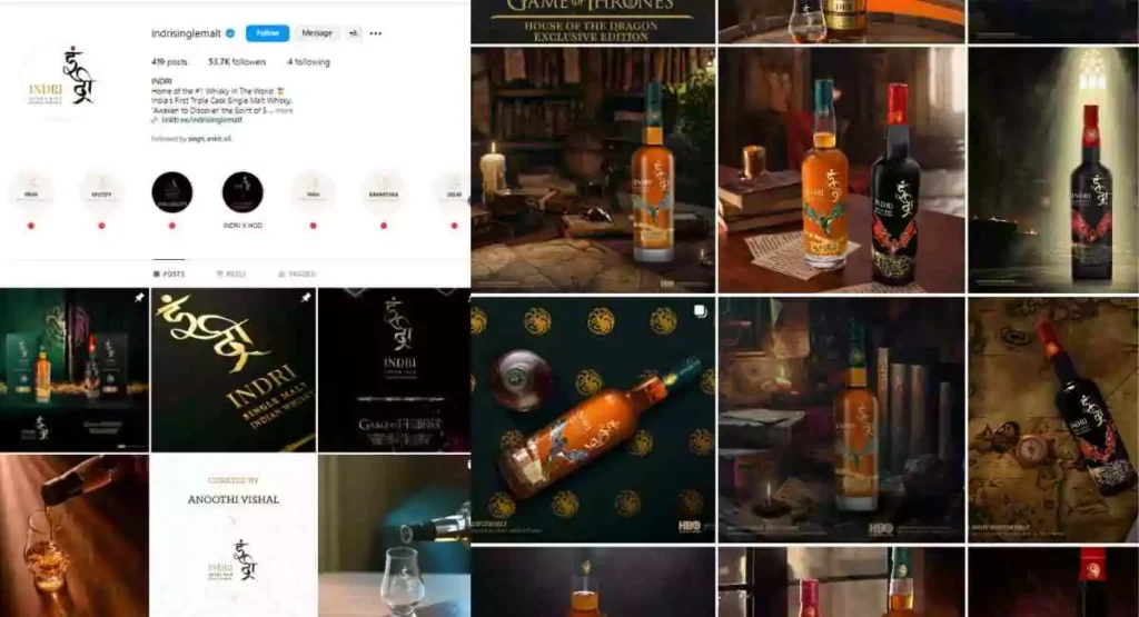 Indri Whisky has also worked on developing a unique brand identity with its logo, color theme, and overall visual consistency. Their posts on Instagram and Facebook follow a clear design style, making the brand easily recognizable. This kind of branding creates a strong connection with the audience and helps in building a loyal customer base.