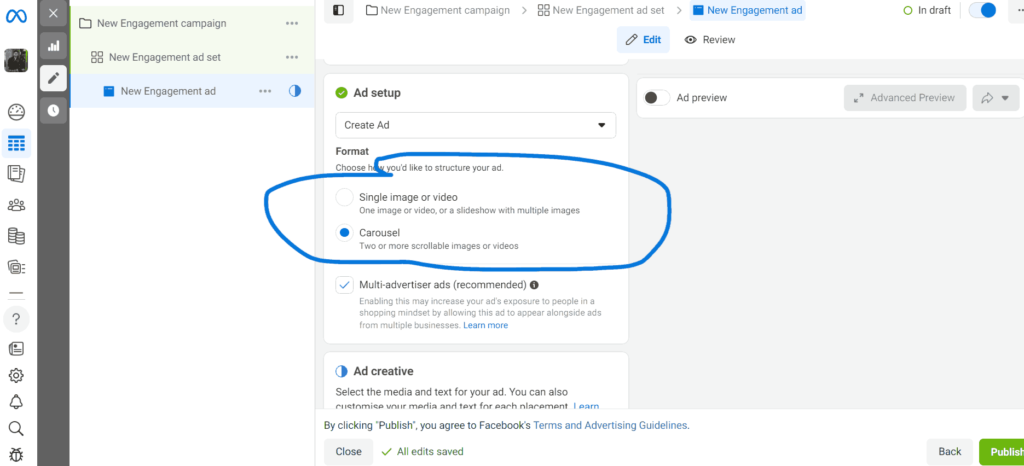 Creating an organic carousel post on Facebook through Ads Manager can be a handy workaround for users wanting to post multiple images without running an actual ad campaign. Here’s how you can set this up: