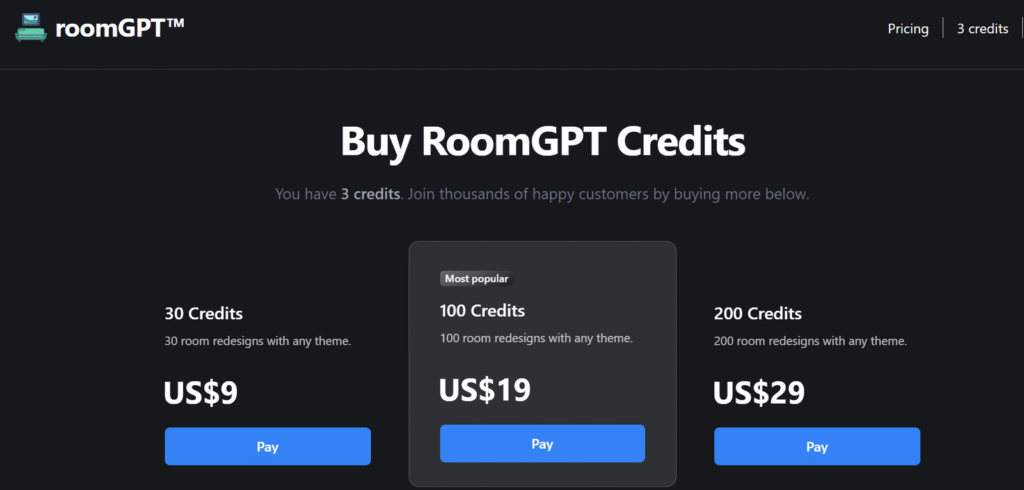 200 Credits: This plan is for those wanting to redesign their entire home or businesses that want to use Room GPT for commercial purposes. It includes 200 room redesigns with any theme. The price is US$29.